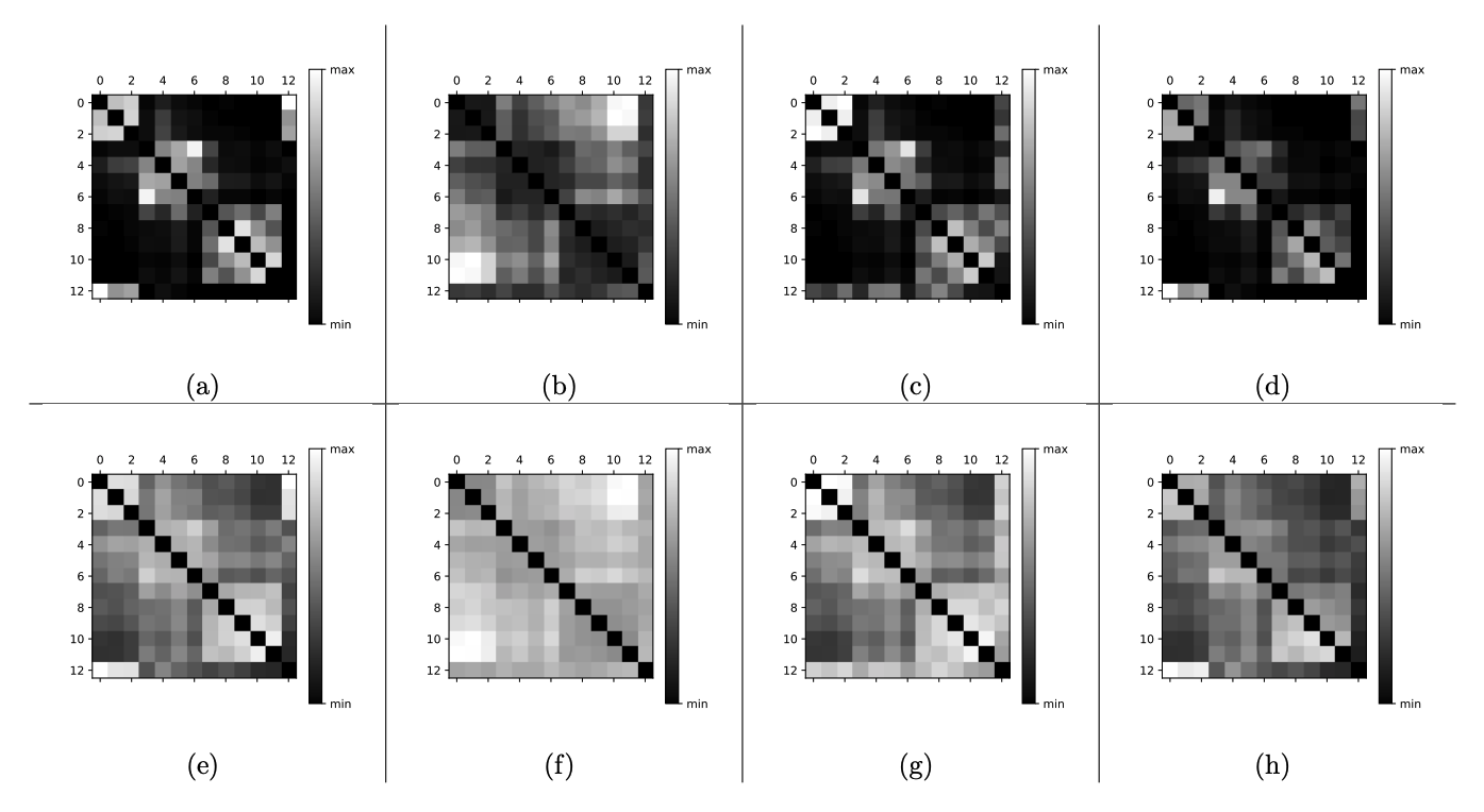 - e) This similarity matrix resembles matrix a), albeit it is brighter, which means that the average similarity scores are higher. This would align with using a Gaussian kernel parameterized with a higher , such as 5.